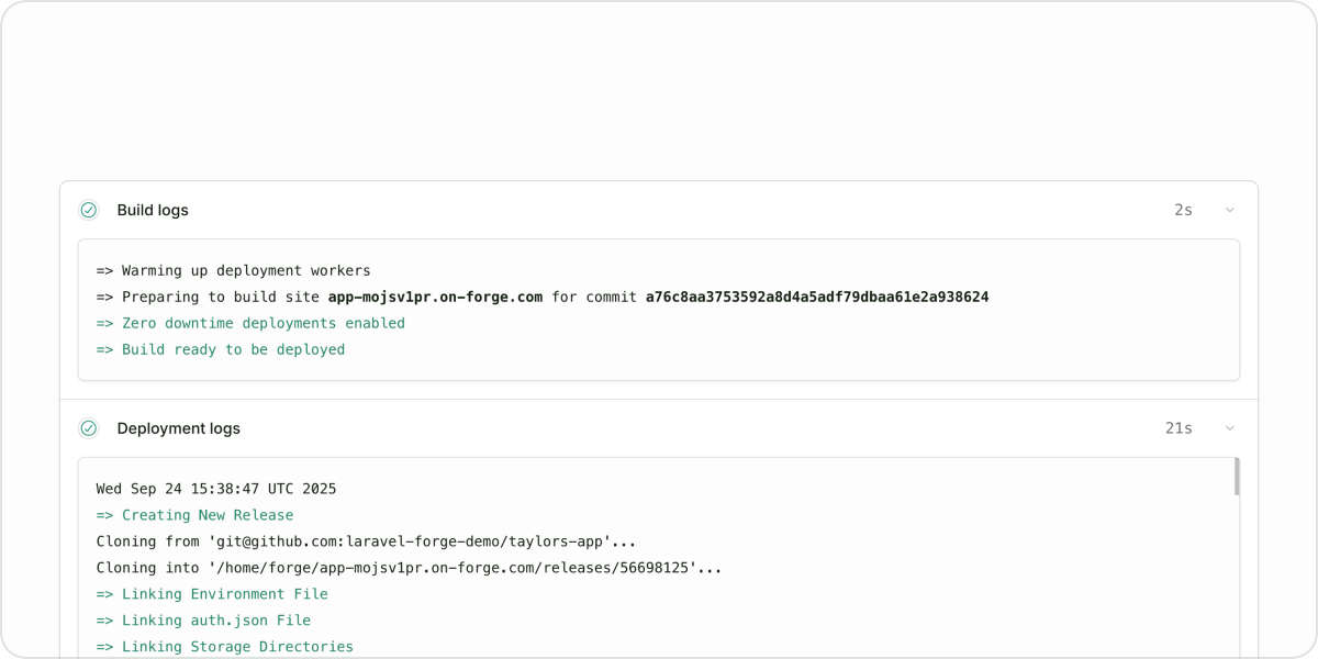 Deployments now run without taking your site offline, giving you added confidence every time you ship. When creating a new website in Forge, zero-downtime deployments are enabled by default; however, you can choose to disable this feature.You cannot enable zero-downtime deployments for existing sites. Learn more