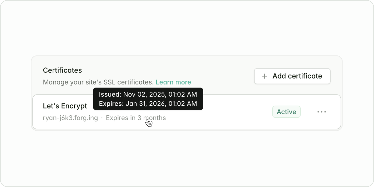 We have made several improvements to the SSL certificate UI.You can now see relevant domains, status, issue date, and expiration date on the certificate card under Certificates, on the Domains tab.Details on why the most recent attempt to renew or issue a certificate are now easily accessible in the View Output option.Multiple domains sharing a certificate can be copied all at once by clicking on the domains listed in the card details. Learn more